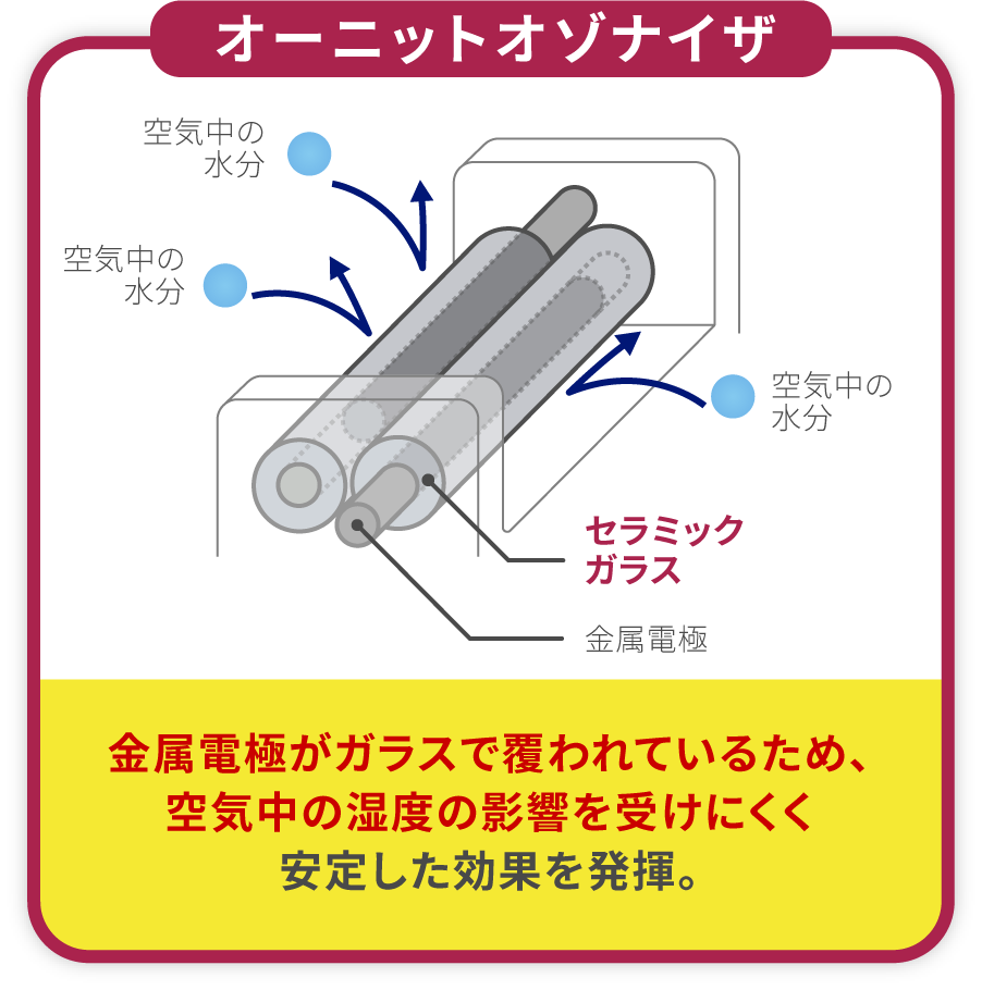 一般的なオゾナイザは、片バリア放電(電極の片側のみを誘電体で覆う)なのに対して、オーニットオゾナイザは特許技術により両バリア放電(両電極を誘電体で覆う)を、小型オゾナイザで初めて実現しました。それにより、湿度により不安定になる放電現象を安定させることに成功しました。また、放電による電極の摩耗もなく、表面に付着した汚れも除去する事で性能を維持することができます。一般空気を原料に長期間・安定してオゾンを生成できるのが、オーニット独自の高性能オゾナイザです。